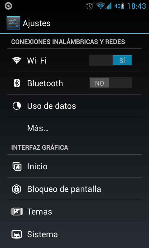 Para ello en la lista de aplicaciones buscamos y abrimos el Icono de Ajustes . Vemos este menú: