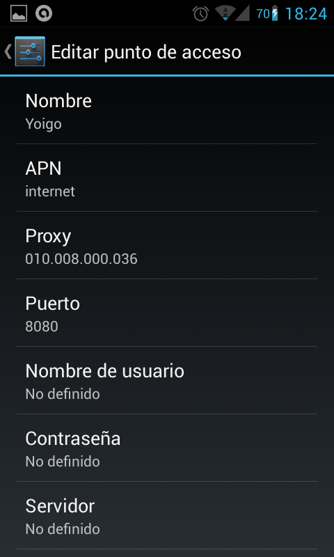 Entras y metes los datos exactamente como estén en la web, mayúsculas y minúsculas y si algo no nos lo dan, no lo rellenamos. Ojo yo he tenido problemas al guardar si das atrás pierdes los datos, para salvar dar al menú y dar «Salvar APN» y después atrás.