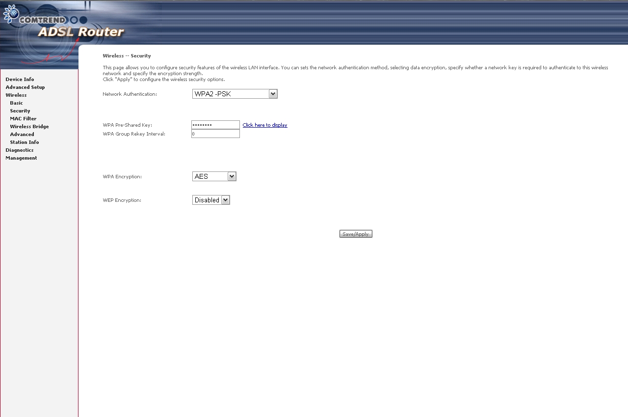 - Después cambio la clave de acceso, elijo un nivel de seguridad yo uso «WPA2-PSK», y cambiamos la clave de acceso donde pone «WPA Pre-Share Key» y damos al botón «save/apply», esta clave intentad que tenga algo de seguridad, que combine letras y números, no pongáis nunca 1234, ni vuestra fecha de nacimiento, ni el nombre de vuestro hijo, ni el de la mascota, no repitáis el nombre de la Wi-Fi, etc.